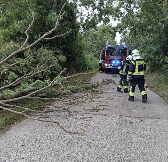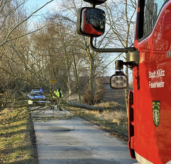 Gerade als wir den Einsatz in Boltenhagen beendet hatten, kam erneut eine Alarmierung. Zwischen Goldbeck und Kühlenstein ist ein Baum gekippt und hing in einer Telefonleitung.