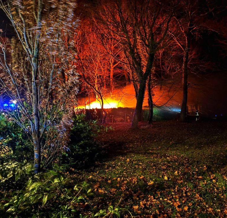 Wir wurden zum Brand einer Freilichtbühne nachalarmiert, dieser breitete sich aufgrund des Sturmes rasant aus.