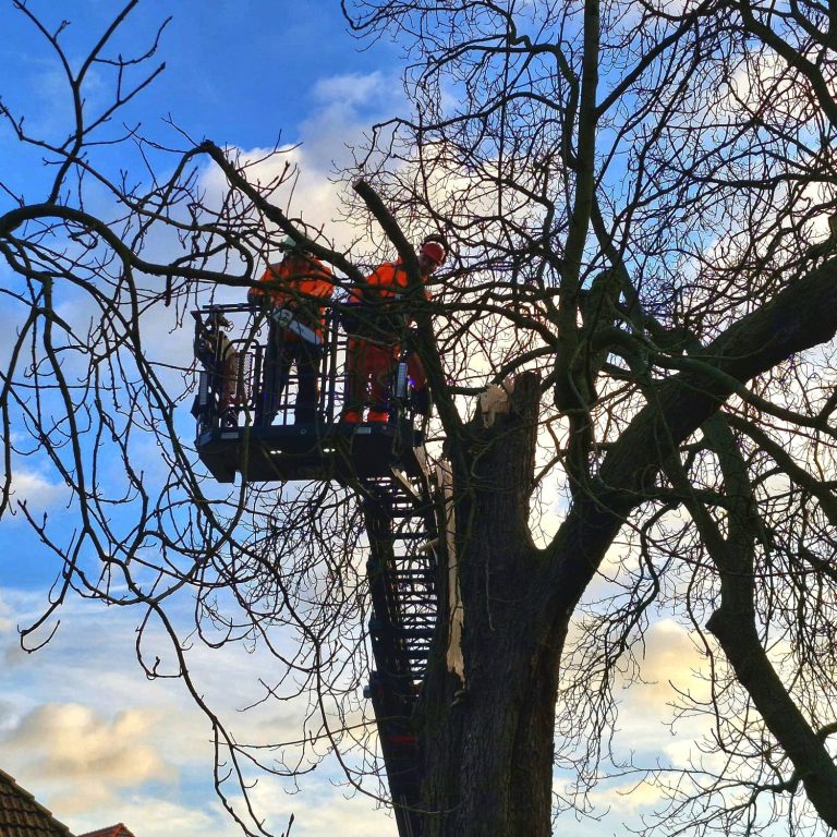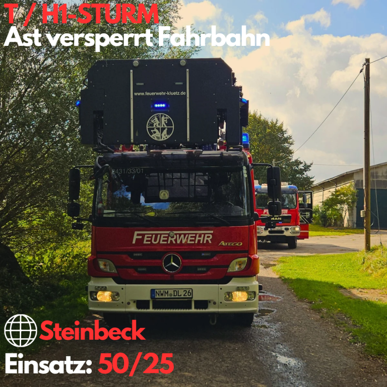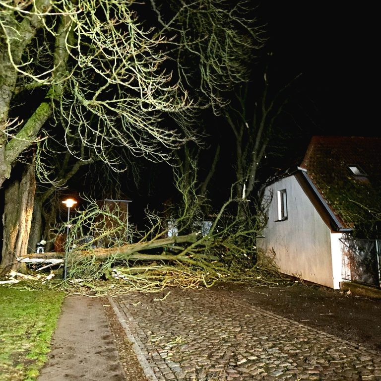 Erneut wurde unsere Drehleiter zum Einsatzort des gestrigen Abends alarmiert. Vor Ort wurde der durch den Sturm abgebrochene Baum weiter aufgearbeitet, lose Äste aus Baumkronen entfernt und lose Dachziegel gesichert. Der Bauhof der Stadt Klütz unterstützte uns bei den Arbeiten.